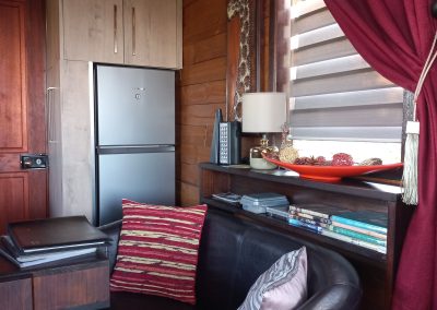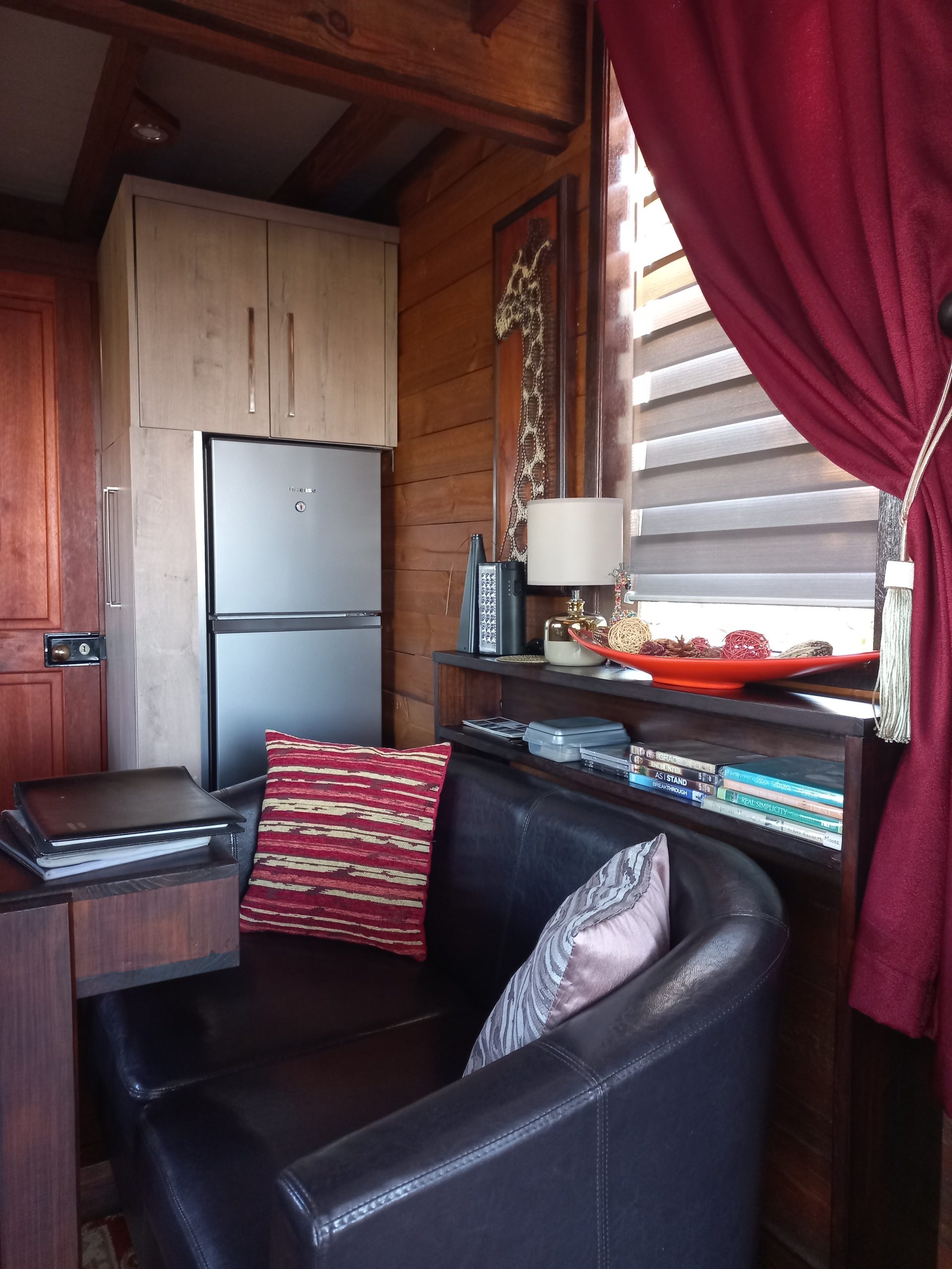 The living area consists of: A wardrobe with hangers for easy storage, two-seater sofa with small coffee table and kitchen. The kitchen is fully equipped with an under counter fridge and freezer compartment, a two plate gas stove, single sink – hot and cold water as well as all utensils, crockery, cutlery and cookware. Soap and dishcloths are provided as well as: salt, pepper, portions of tea, coffee, sugar and rusks. A microwave and toaster are available.